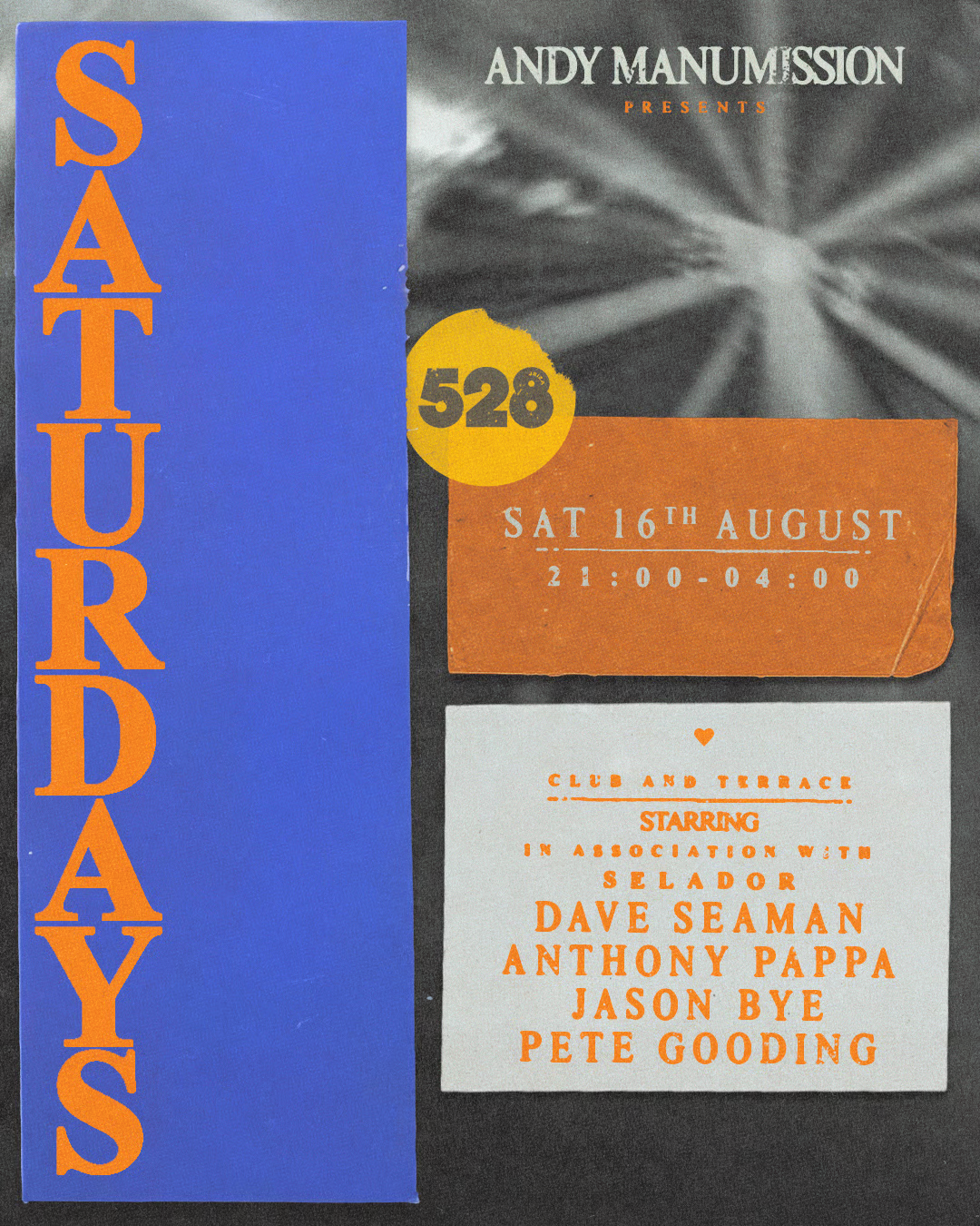 El sábado 16 de agosto, la noche se llena de house melódico y energía cósmica con una edición especial de Andy Manumission Presents, en colaboración con el sello Selador. De 21:00 a 04:00, la terraza y el club contarán con los sets de Dave Seaman, Anthony Pappa, Jason Bye y Pete Gooding.