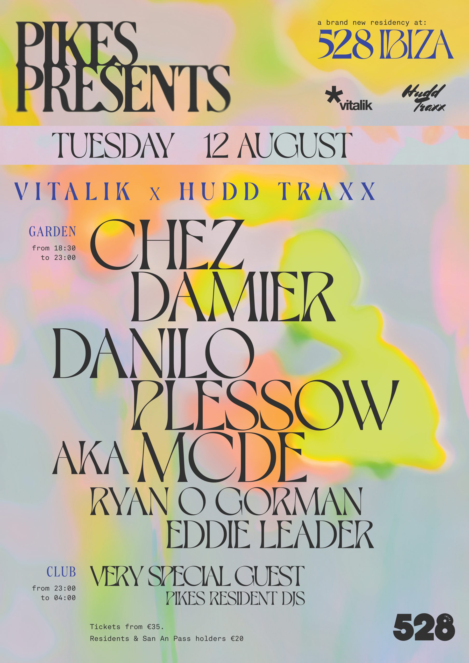 El martes 12 de agosto, 528 Ibiza recibe una noche de culto para los amantes del house más fino con Vitalik x Hudd Traxx. Desde las 18:30 en el Garden, actuarán leyendas como Chez Damier, Danilo Plessow (MCDE), Ryan O Gorman y Eddie Leader. A partir de las 23:00, el club toma el relevo con un invitado sorpresa y los residentes de Pikes.