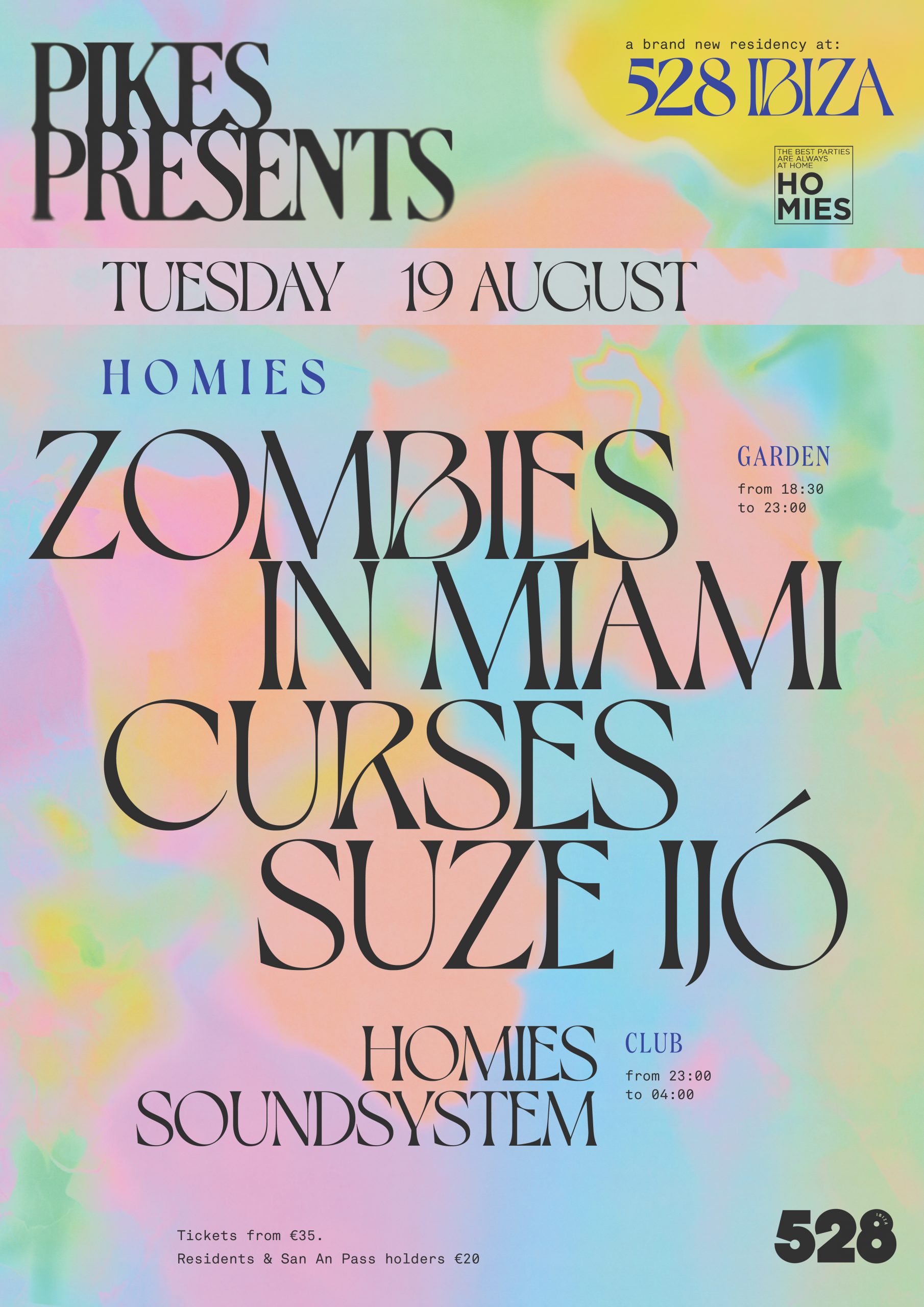 El martes 19 de agosto, 528 Ibiza acoge una nueva edición de Homies, la fiesta más desenfadada y colorida de la temporada. Desde las 18:30 hasta las 23:00, el Garden se llenará del sonido de Zombies in Miami, Curses y Suze Ijó, en una tarde de electrónica vibrante y ecléctica.