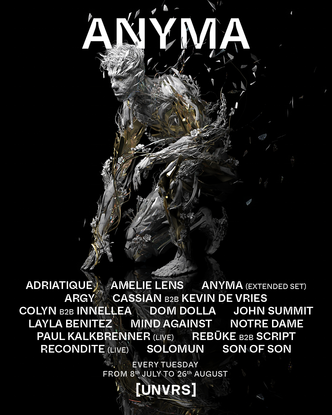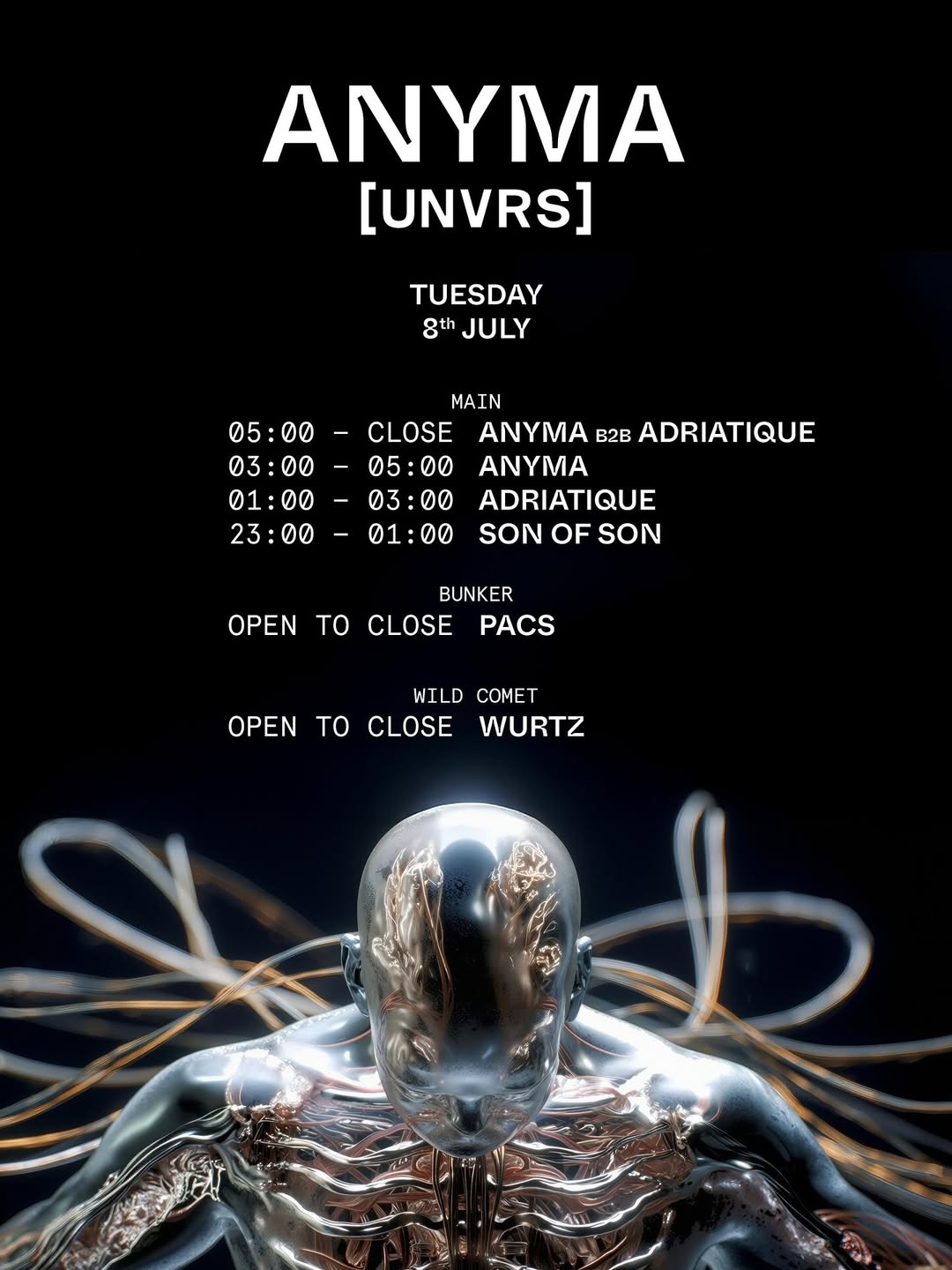 La llegada de Anyma a [UNVRS] representa una sinergia perfecta entre dos fuerzas a la vanguardia de la innovación en la música electrónica. Anyma trae su universo experiencial a un espacio diseñado específicamente para potenciarlo aún más. Cada noche está concebida como una experiencia en tiempo real: inmersiva, reactiva y completamente alineada con el lenguaje visual que ha desarrollado a lo largo de años de trabajo interdisciplinar.