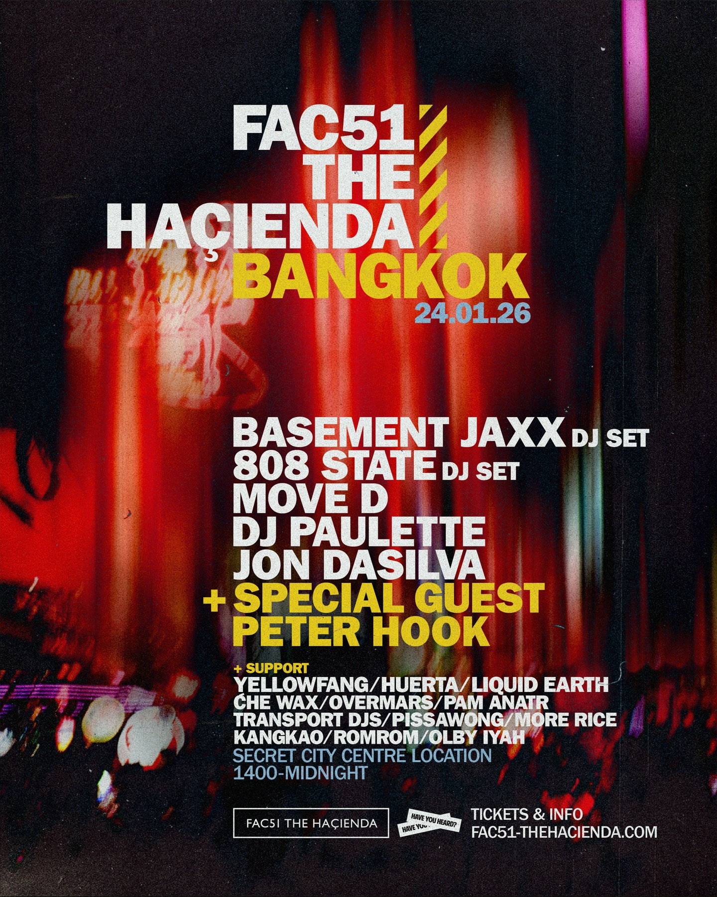 El 24 de enero, la legendaria FAC51 The Haçienda regresa a Bangkok para transformar Ambience Space en una experiencia festivalera diurna con múltiples salas, el primer evento de esta magnitud en el local y un momento histórico para el panorama cultural en constante evolución de la ciudad. El debut en Bangkok de Basement Jaxx como DJ encabeza el cartel, junto al exbajista de Joy Division y New Order, Peter Hook, que tocará junto a leyendas de Manchester como 808 State, Jon Dasilva, DJ Paullete y más house y tech de Move D, Huerta, Liquid Earth y otros.