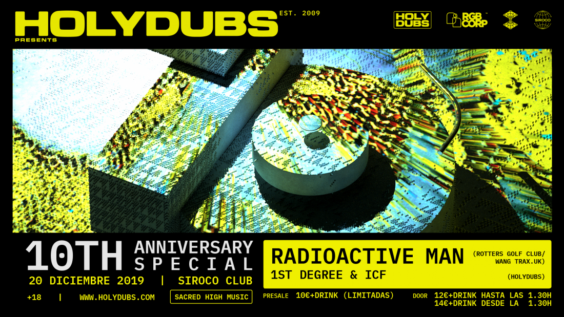 La fiesta por el 10º aniversario como tal se llevará a cabo el viernes 20 de diciembre en la popular Sala Siroco, epicentro de las fiestas Holydubs en estos últimos años en la capital. Para una fecha tan señalada contarán como invitado de excepción a Radioactive Man. El dj y productor inglés es una de figura emblemática del electro europeo y su presencia en Madrid coincide con el lanzamiento de Doors To Manual, una retrospectiva de sus 20 años de carreraeditado en un box set especial de 4 vinilos. 1st Degree e ICF ejercerán de anfitriones y dj residentes en una noche ideada para no parar de bailar y brindar por otros diez años más. Las entradas ya están a la venta pinchando en este enlace.