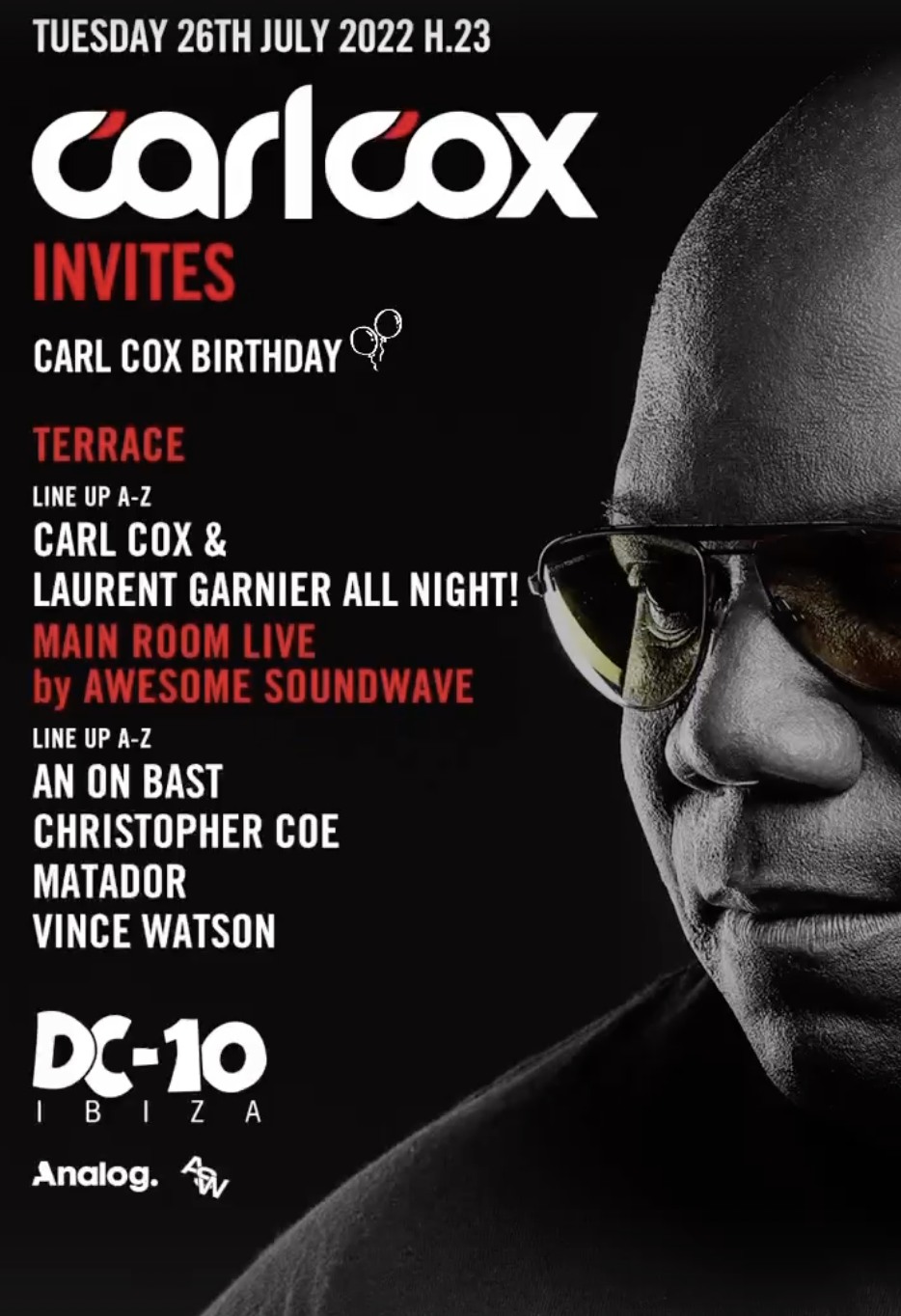 Además de Carl Cox y Laurent Garnier, en la main room de DC10 estarán: An On Bast, Christopher Coe, Matador y Vince Watson.