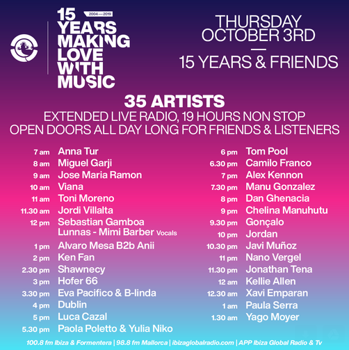 Durante estos últimos 15 años, Ibiza Global Radio se ha convertido en una de las mayores marcas de música electrónica del mundo, llegando a 16 millones de oyentes al mes a través de su emisora de radio y televisión online y más de 1,5 millones de seguidores en las redes sociales. Es por ello, que este jueves desde las 7am hasta las 2am se hará una maratón non stop de artistas invitados celebrando los últimos 15 años con mucha música durante las 18 horas.