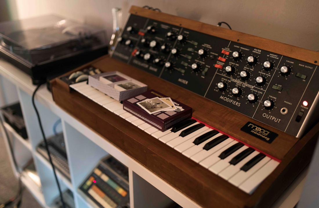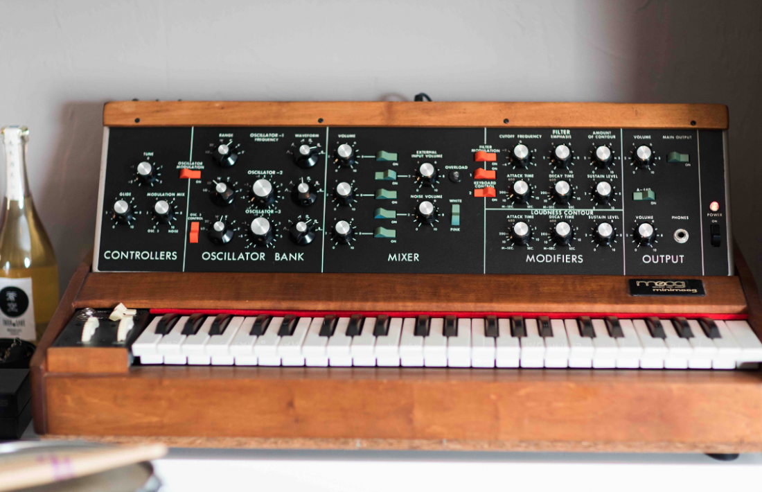 The grand Dame, un Minimoog Modelo D original de 1975 que utilizo en cada una de mis pistas. Stevie Wonder, Pink Floyd y Tina Turner ya lo usaron en los años 70, desprende mucha potencia y es único en su tipo y  por supuesto, sería el último sintetizador que vendiese si es que algún día tengo que hacerlo.