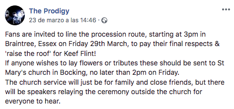 The Prodigy, a través de sus cuentas en redes sociales, han informado a sus seguidores que son más que invitados al paseo que se celebrará antes de la misa dónde se le dará un último adiós a Keith Flint el próximo viernes 29 de marzo.