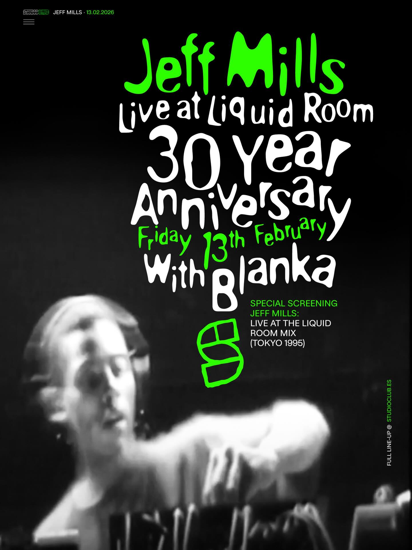 La sala abrirá sus puertas a las 22:30 y, entre 23:00 y 00:00, se proyectará Jeff Mills: Live from the Liquid Room, como introducción a una noche pensada para la memoria, la evolución y la pista de baile.