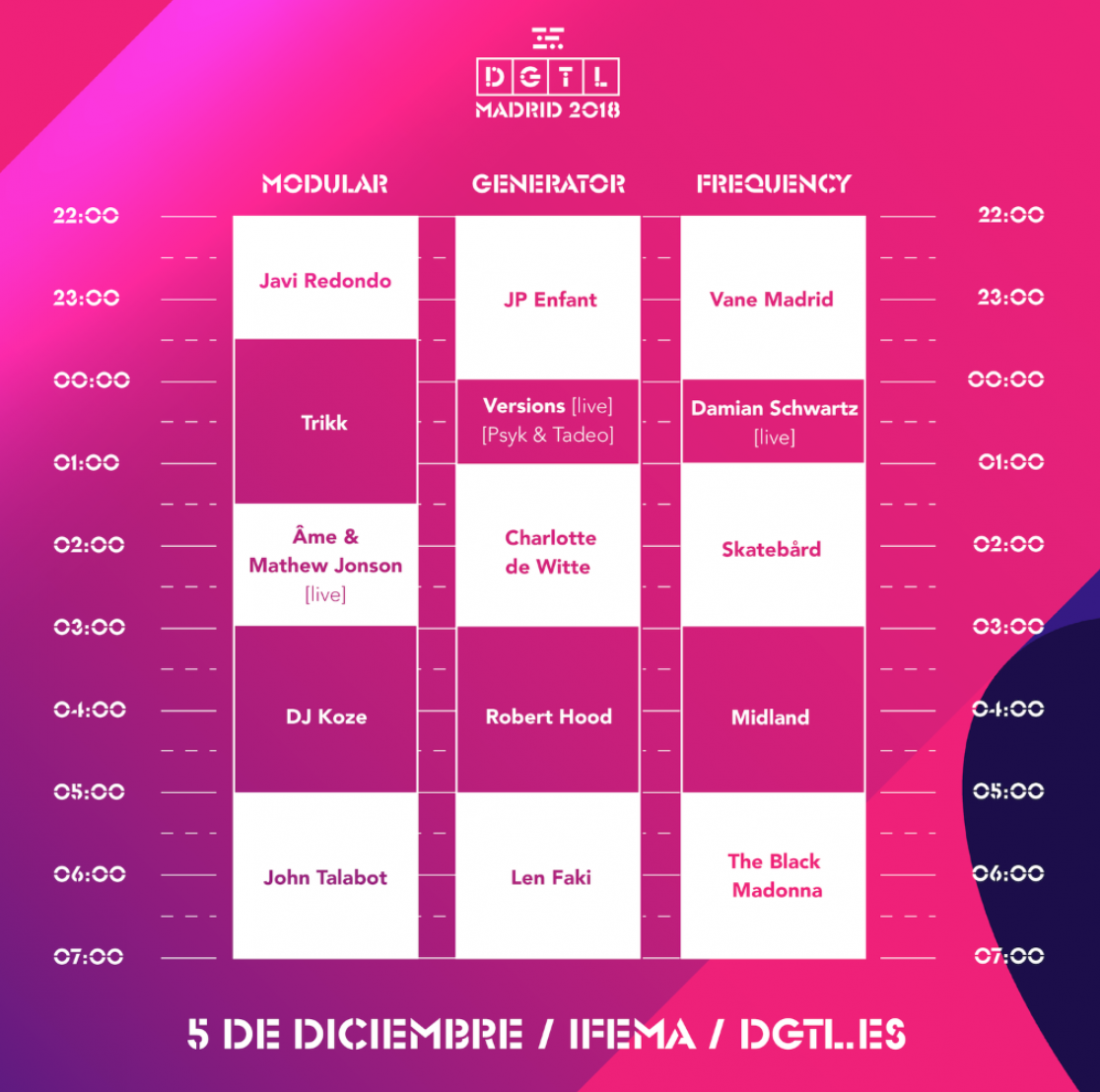 DGTL Madrid, que tendrá lugar el próximo 5 de diciembre en IFEMA en horario nocturno de 22:00 a 07:00, acaba de anunciar los horarios de su primera edición. Durante nueve horas, el festival ofrecerá una experiencia que se podrá vivir a través de sus tres escenarios Modular, Generator y Frequency -que responden a las distintas partes de un sintetizador-, para llevarnos de viaje por el amplio espectro de la música electrónica. Así pues, la feria madrileña rezumará Chicago house, techno y otros sonidos más experimentales, para satisfacer a los amantes de la música de baile gracias a un cartel donde se pueden encontrar múltiples exploraciones dentro de este amplio género.