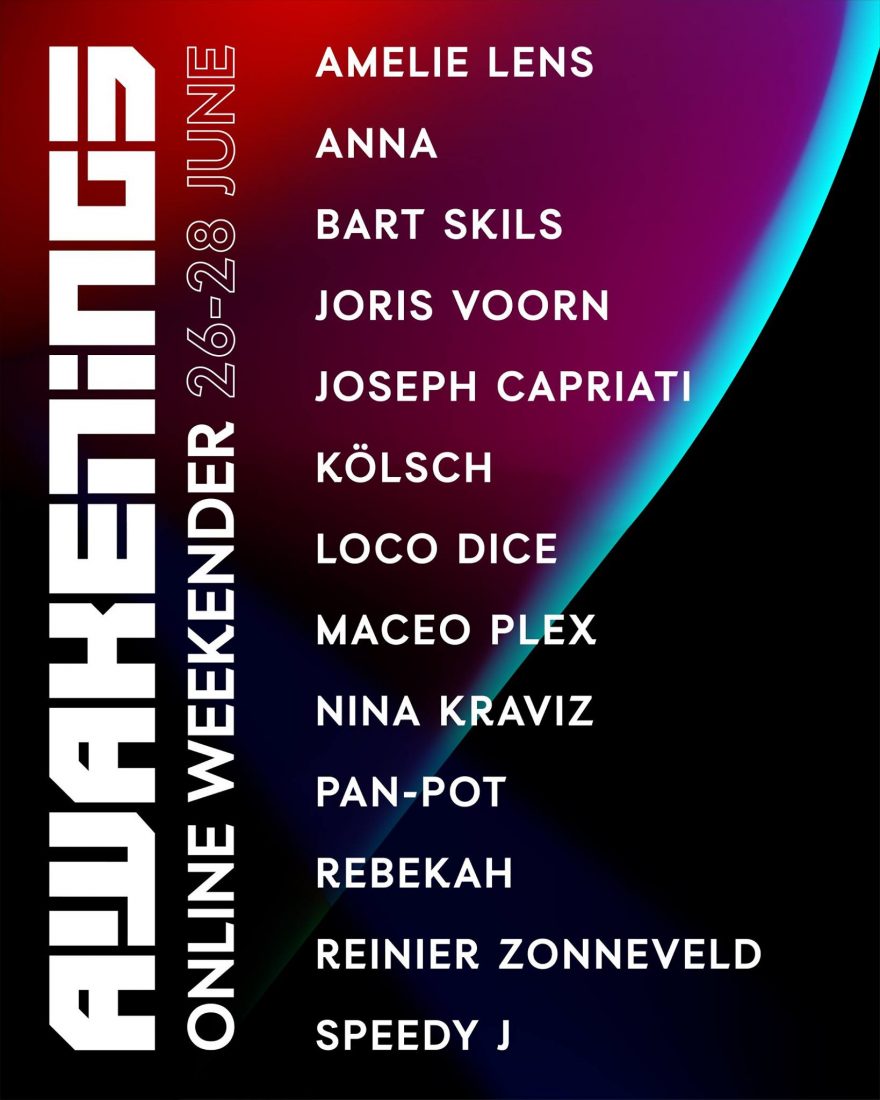 El evento on-line que se celebrará durante todo el fin de semana de manera on-line en las diferentes cuentas de Awakenings, contará con los siguientes artistas invitados: Amelie Lens, Anna, Bart Skils, Joris Voorn, Joseph Capriati, Kölsch, Loco Dice, Maceo Plex, Nina Kraviz, Pan-Pot, Rebekah, Reinier Zonneveld y Speedy J.