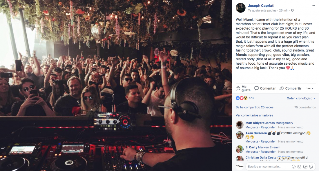 El local, Heart Nightclub, ha sido el lugar escogido por Joseph Capriati para pinchar durante 25 horas y 30 minutos. Capriati ha dejado una palabras al respecto de esta maratoniano set, hace unos minutos en su cuenta de Facebook.