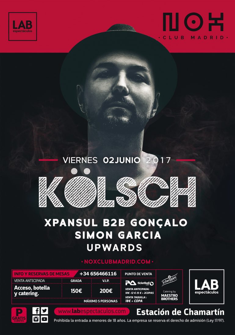 El cabeza de cartel es Kölsch, artista destacado dentro de la nueva ola de Techno que ha surgido en los últimos años a nivel internacional y uno de los poquísimos Djs y productores que puede referirse y actuar en la etiqueta Kompakt como en su propia casa. Sven Väth, Hawtin o Ricardo Villalobos son sólo algunos de los grandes nombres de la industria electrónica que se han rendido ante este danés y su sonido, que hunde las raíces en los ritmos clásicos de Chicago y Detroit. El line-up también incluye al portugués Gonçalo Back to Back con Xpansul, otra de las figuras esenciales de la escena nacional, en el recuerdo de muchos todavía perduran sus residencias en Soma y Coppelia 101, e integrante de los sellos True Type Tracks y w0rkt34m. Cierra el cartel Simón García, dueño de uno de los sonidos más futuristas e hipnóticos que se pueden encontrar en la capital, no es casualidad que sus producciones se hayan editado en Poker Flat, Freerange, Pets, Compost o Supplement Facts.