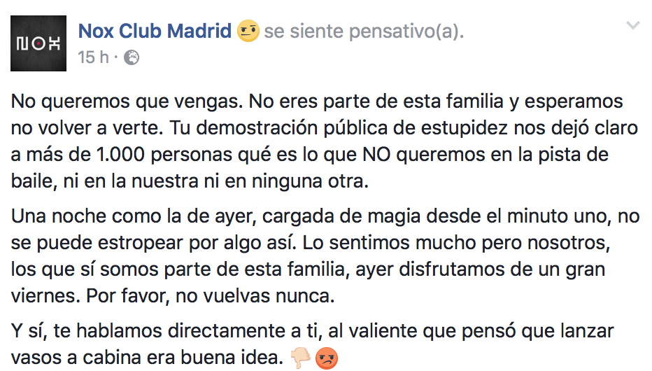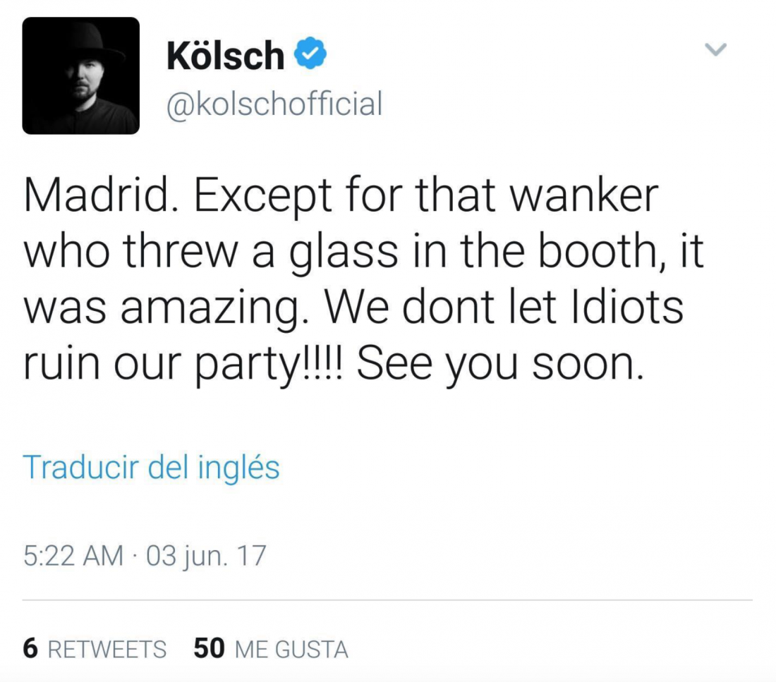 Fue el propio artista nórdico el que denuncio el hecho en su cuenta de Twitter.La promotora encargada de la contratación de Kölsch y del evento, Nox, también ha querido apoyar al artista y denunciar públicamente a la persona que realizo el lanzamiento de vasos, con un comunicado en su pagina de Facebook.