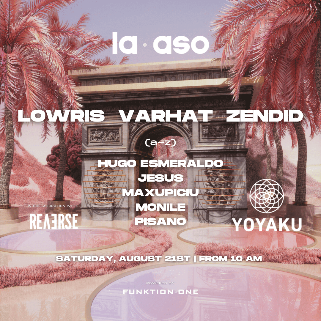 El retorno de LA ASO a la escena musical electrónica de Barcelona ya es una realidad. Tras un periplo invernal por las costas mexicanas y una vuelta a casa por todo lo alto el pasado mes de julio, LA ASO anuncia la segunda fecha de su ciclo estival en la capital catalana para el próximo sábado 21 de agosto. De la mano del sello francés YOYAKU y en colaboración con REVERSE, el público de la Ciudad Condal podrá bailar -sentado y en grupos de máximo 10 personas- al ritmo de Lowris, Varhat y Zendid. Una vez más, el evento será de 10h a 00h y se celebrará en una localización secreta a las afueras de Barcelona, en un municipio en el que no está decretado el toque de queda.