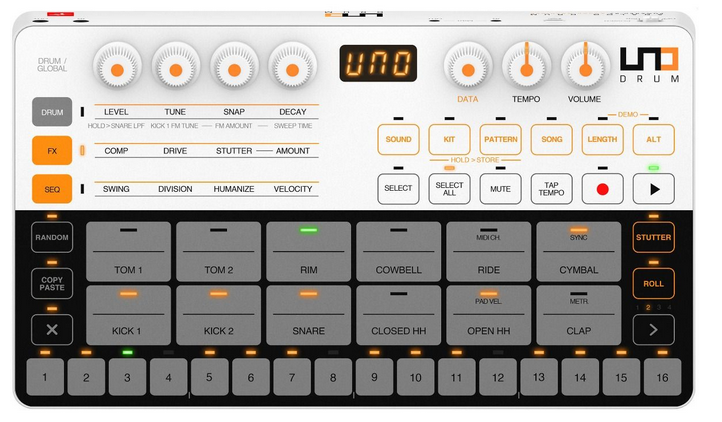 Uno Drum es el segundo hijo del fabricante IK Multimedia, que tras el éxito de su versión SYNTH, vuelve con una caja de ritmos, basada principalmente en el mismo sistema de uso. Posee 12 pads táctiles, 64 pasos para secuenciar en 16 teclas , con opción de modificación de hasta 8 parámetros, 12 voces PCM y 6 analógicas, 100 kits de batería bastante completos y 3 efectos analógicos, completan esta pequeña caja de ritmos, que aunque con un tamaño bastante reducido, y un peso muy ligero, ofrece gran variedad de opciones para componer. Otra de las opciones que le aportan dinamismo y encanto a este producto, es el efecto Roll, para realizar redobles fácilmente y que se pueden modificar en velocidad de repetición. Por supuesto todos los sonidos son modulables permitiendo modificar aspectos como el decay o tune.