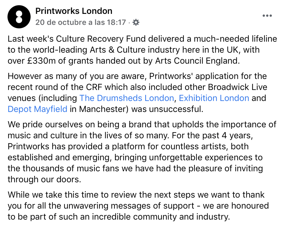 Las ayudas para el sector de la música, eventos y cultura que en otros países como el Reino Unido si existen, han traído polémica tras quedarse fuera de esta ayuda, clubs tan importantes para la escena como Printworks.
