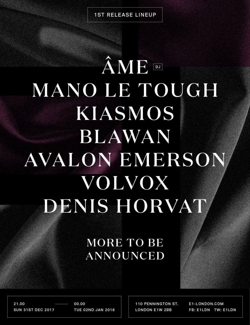 En ciudades como Londres siguen abriendo nuevos clubs. El último en llegar es: E1. Un nuevo club, que realizará su primera fiesta, aprovechando la noche del 31 de diciembre. Para el opening, E1 ha preparado una fiesta que durará 27 horas y en las que se podrán disfrutar de los sets de: Âme, Mano Le Tough, Blawan, Kiasmos, Avalon Emerson, Volvox y Denis Horvat.