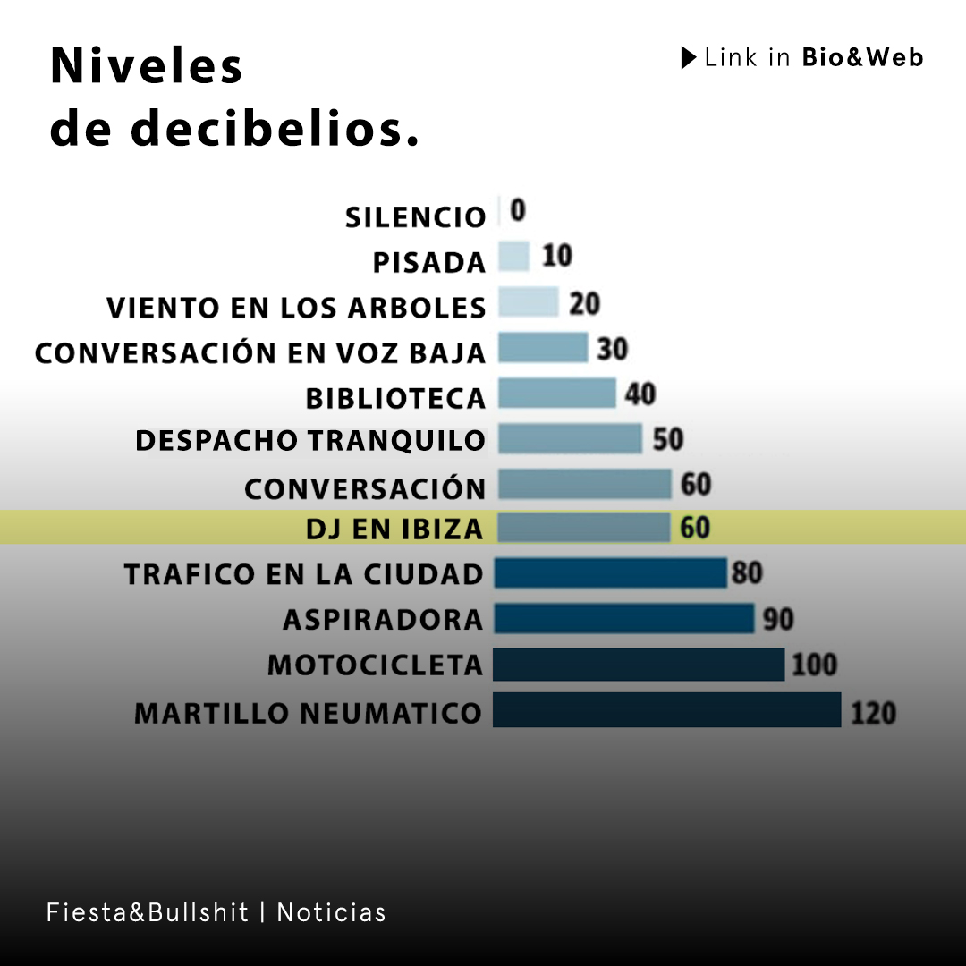 Entre los fragmentos del documento emitido en el día de ayer, encontramos aspectos que pueden irritar a cualquier Dj o profesional de la música. Empezando por la que más afecta a una actuación, que es la del sonido. El Govern de las islas Baleares y sus funcionarios, creen que lo correcto para poder trabajar es 60 decibelios. No hay nada más que ver la siguiente gráfica, para ver la gran injusticia que esto puede suponer.