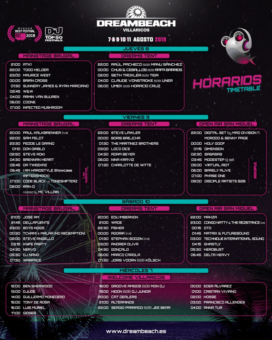 Cada vez está más cerca Dreambeach Villaricos (7-11 de agosto), el punto de encuentro de los fans de la cultura dance a orillas del Mediterráneo. La 7ª cita anual del mayor festival de música electrónica de España tacha días en el calendario con un récord de entradas vendidas desde su fundación, en 2013. La cita reunirá sobre los es-cenarios a un centenar de DJs, vocalistas y artistas electrónicos punteros a nivel global, la programación más ecléctica e internacional de su historia, encabezada por estrellas como Armin van Buuren, Steve Aoki, Don Dia-blo, Steve Angello, Tchami x Malaa, Knife Party, Marco Carola, Loco Dice o Paul Kalkbrenner.