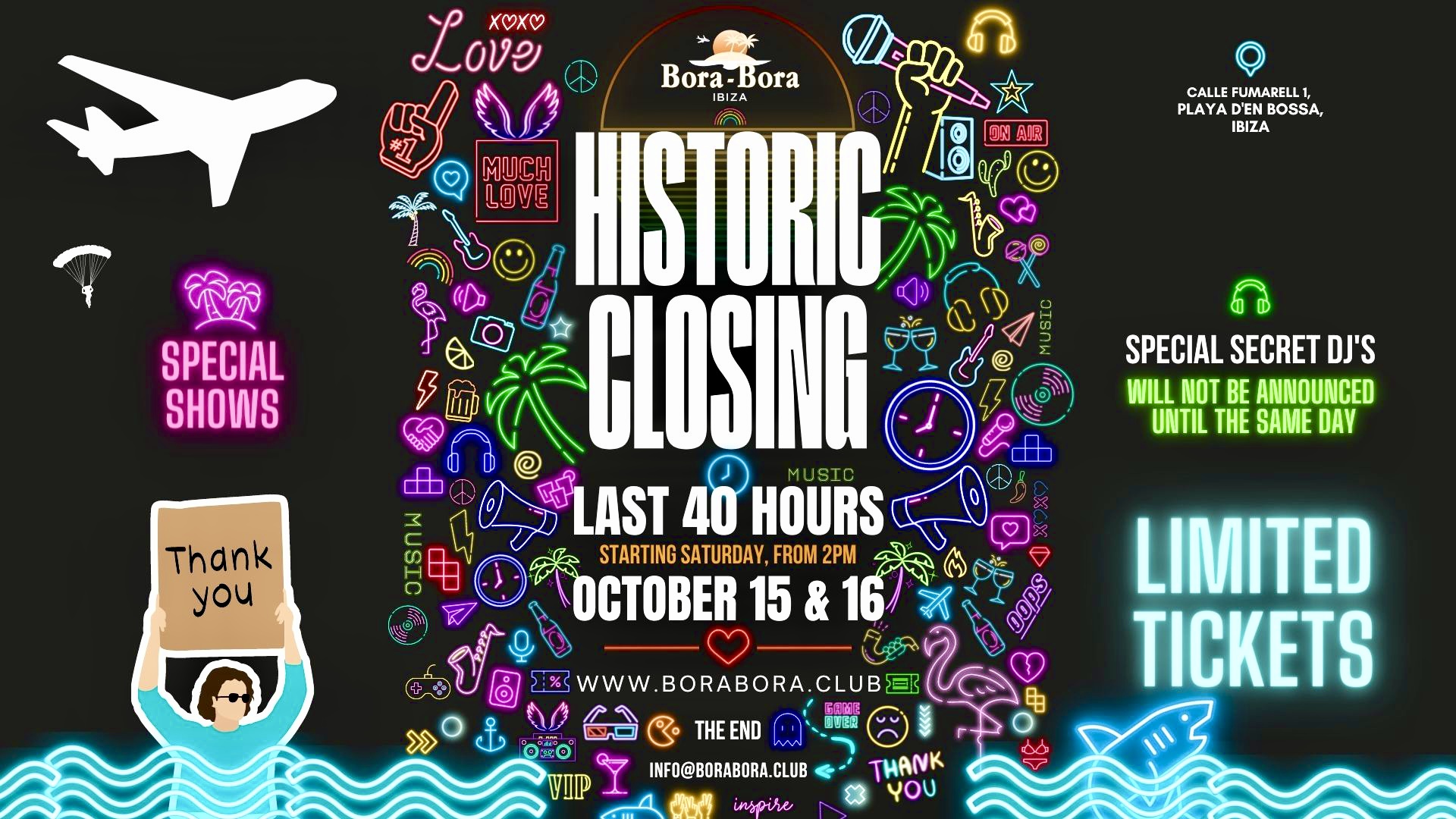 Después de 40 años de historias y locuras convirtiendo a Bora Bora en toda una leyenda de la isla, el club se despide de Ibiza y de todos nosotros con dos días de fiesta máxima. Un evento donde vivir un remember brutal lleno de shows y personajes invitados como “Spiderman Bora Bora”, que acompañará en esta despedida. Como siempre y al estilo Bora Bora, no se anunciará nada más hasta el último momento.