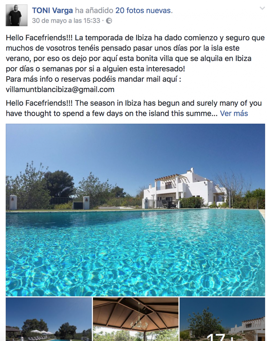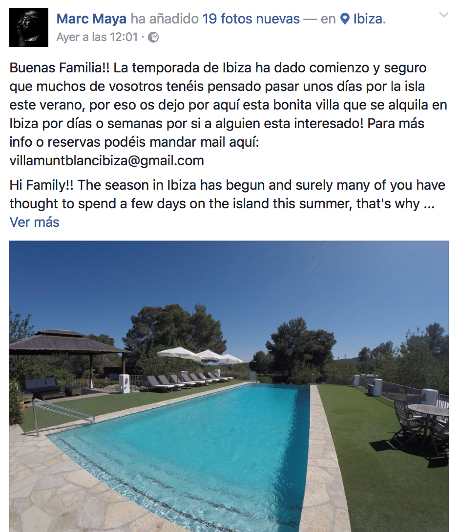 En los últimos días hemos visto como varios Djs de elrow, como Toni Varga y Marc Maya, que por cierto comenzaron su temporada 2017 este pasado sábado en Amnesia, han publicado en sus redes sociales “ofertas”, desconocemos si remuneradas o no, para que sus fans alquilen una villa en Ibiza. En la descripción del “anuncio” se incluye una dirección de gmail, para los que quieran contratar el alquiler de esta villa.