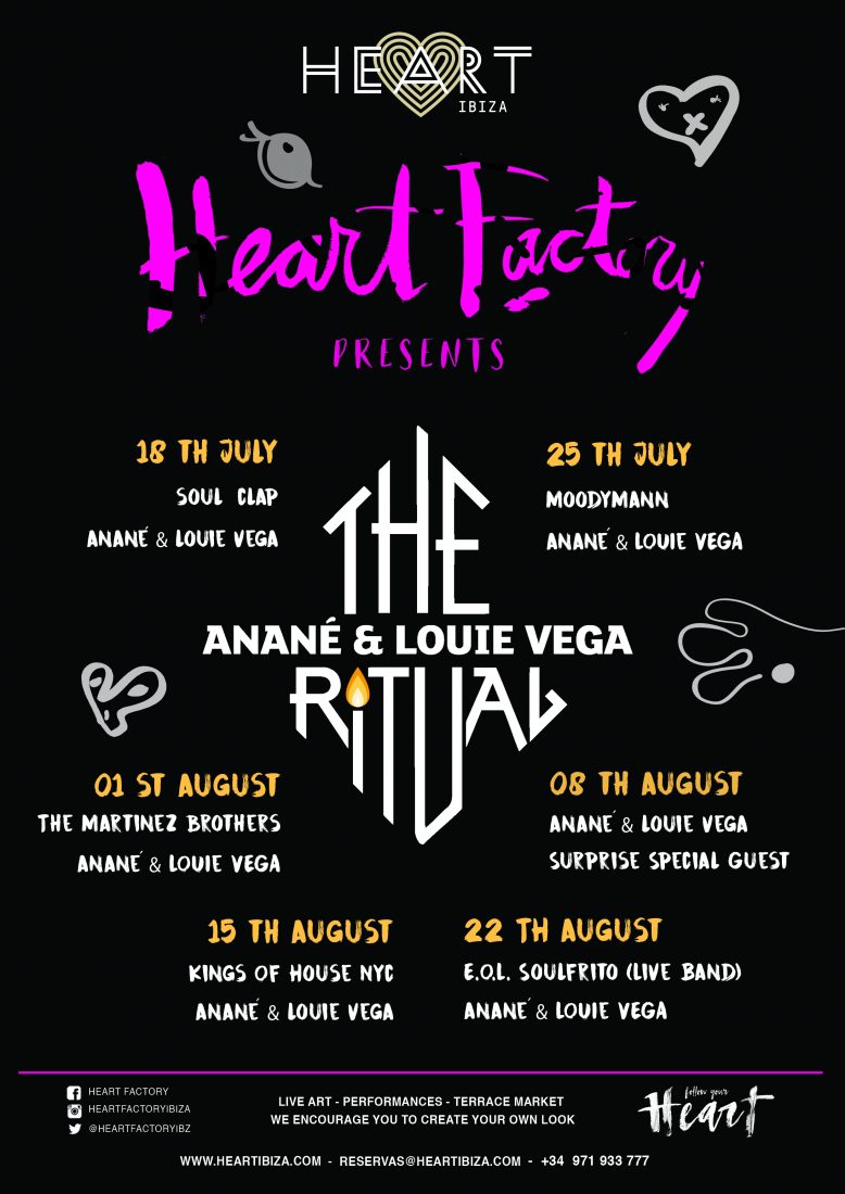The Ritual, es una de las fiestas más esperadas del verano en Ibiza. Hace algunas semanas anuncio su impresionante line up para las seis semanas de residencia que tiene este verano en Heart Ibiza. Las noches de los martes, a partir del hoy 18 de julio, Louie y Anané Vega serán los encargados de impulsar los latidos del corazón del club de los hermanos Adrià y el fundador del Circo del Sol, Guy Lalibertè, con invitados de la talla de Soul Clap, Moodyman, The Martínez Brothers y algunas sorpresas más.