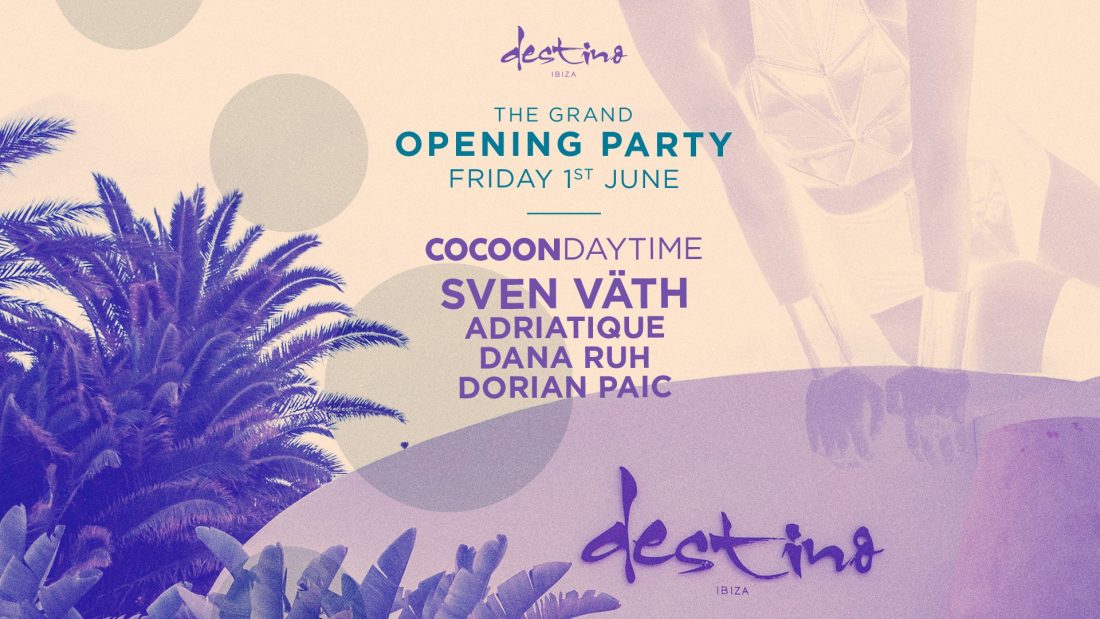 A unos pocos kms, exactamente en el municipio de Jesus, el resort del grupo Pacha, Destino, abrirá sus puertas para este 2018 (fiesta de apertura, ya que el complejo ya lleva algún tiempo abierto) con una fiesta de opening que encabeza el gran fichaje del grupo en este 2018, Sven Vath. Además del alemán, le acompañaran: Adriatique, Dana Ruh y Dorian Paic.