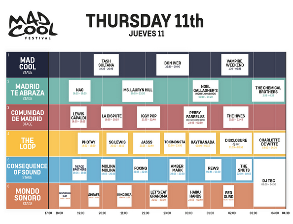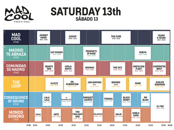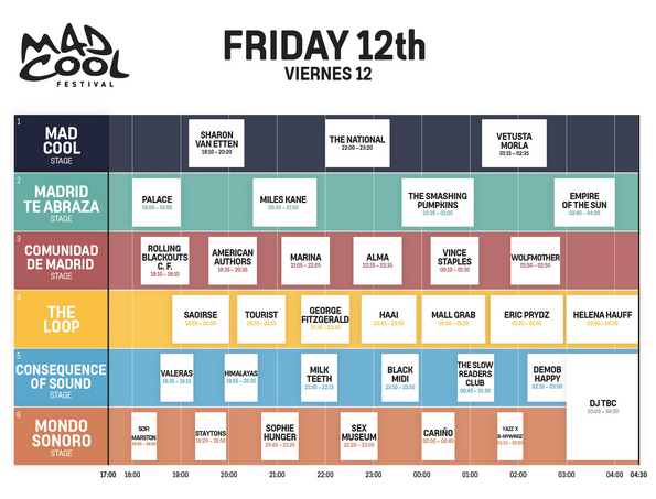 Os dejamos los horaios dónde artistas como Jon Hopkins, Helena Hauff, The Chemical Brothers o Mall Grab y bandas como The Cure, Bon Iver o The Smashing Pumpkins de entre otras muchas, se dejarán ver por la capital española.