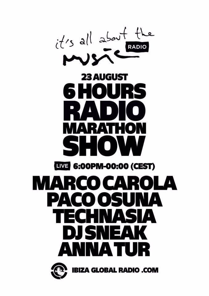 El especial de It’s all about the Music comenzará a las 18:00h y hasta las 00:00h, podremos disfrutar de las sesiones de Marco Carola, Technasia, Dj Sneak y los artistas españoles; Paco Osuna y Anna Tur.
