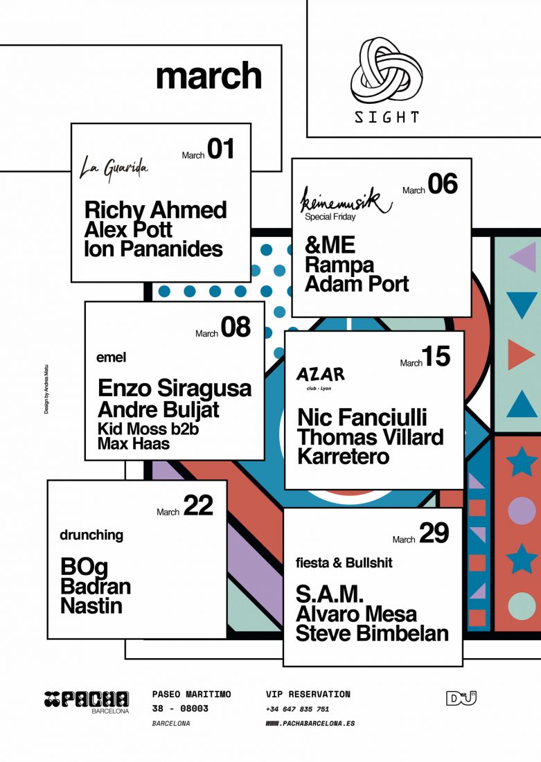 ¡Vaya marzo nos espera con SIGHT! Después de un mes de febrero en el que la sesión volvió por todo lo alto a su casa, Pacha Barcelona, llega un mes de marzo que discurrirá entre avenidas house y techno. Para el tercer mes de este 2020, SIGHT trae a algunos de los artistas más queridos de la sesión, además de interesantes promesas de la electrónica de toda Europa. Cinco fechas y un bonus especial, el viernes 6 de marzo, harán de marzo un mes de lo más especial en SIGHT…
