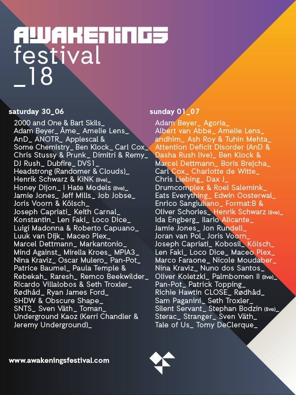 Como cada año, Awakening, vuelve a sorprender, con un listado de artistas techno invitados, en los que pocos son los que faltan. Más de cien artistas estarán en los dos días de Techno en Amsterdam, que espera recibir la visita de unos 80.000 clubbers, venidos de todo el mundo.