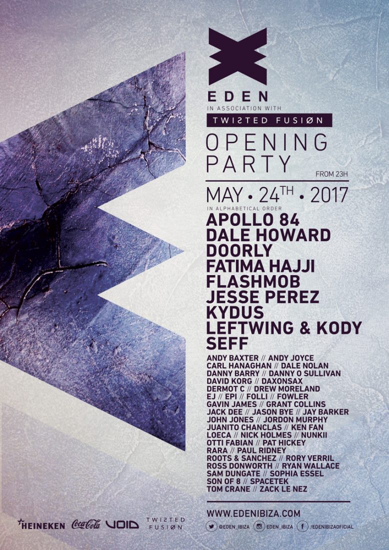 El mismo día que el Ibiza International Music Summit (IMS) levanta el telón de su edición número 10, y en asociación con el sello Twisted Fusion, Eden Ibiza presenta este 2017 la mejor programación de un opening party hasta la fecha: Apollo 84, Dale Howard, Doorly, Fatima Hajji, Flashmob, Jesse Perez, Kydus, Leftwing & Kody y Seff.