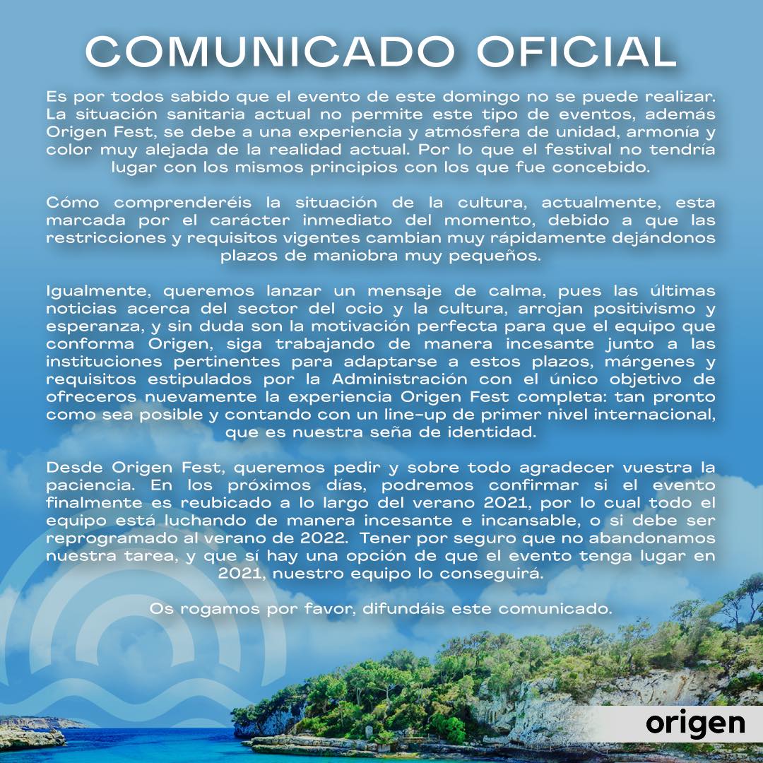 Seguimos hasta la isla de Mallorca, allí el festival Origen que tenia previstas diferentes fechas a lo largo del verano de 2021, también ha tenido que cancelar sus fechas y esperar que ya en 2022 sea la vuelta a la normalidad que tanto añoramos.