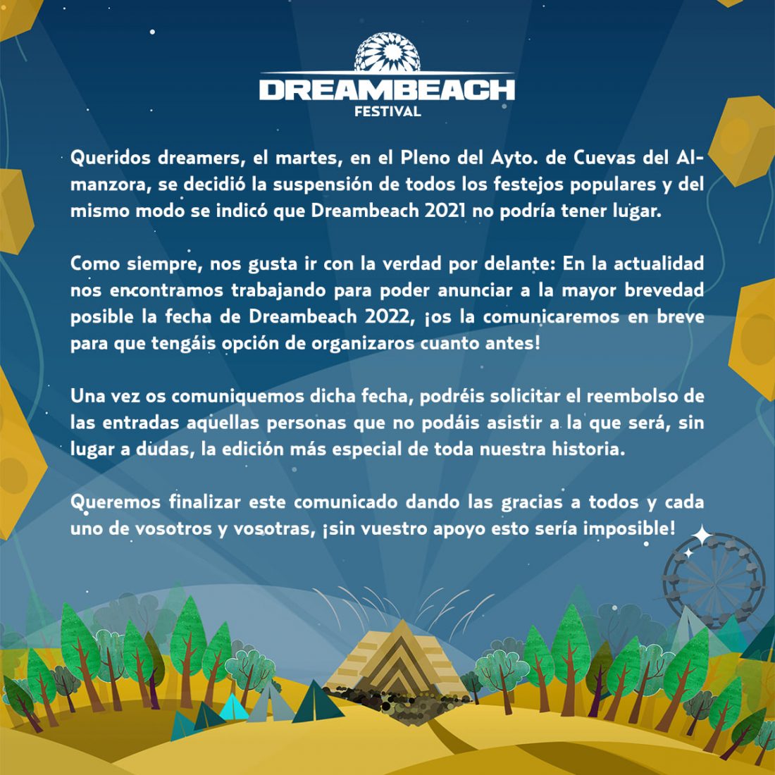 Comenzando en el Sur, exactamente en el municipio de Villaricos en Almería, donde cada mes de agosto se celebra el festival Dreambeach y que ha comunicado su cancelación después de que lo hiciera el propio Ayuntamiento del municipio cancelando todos los actos festivos del verano.