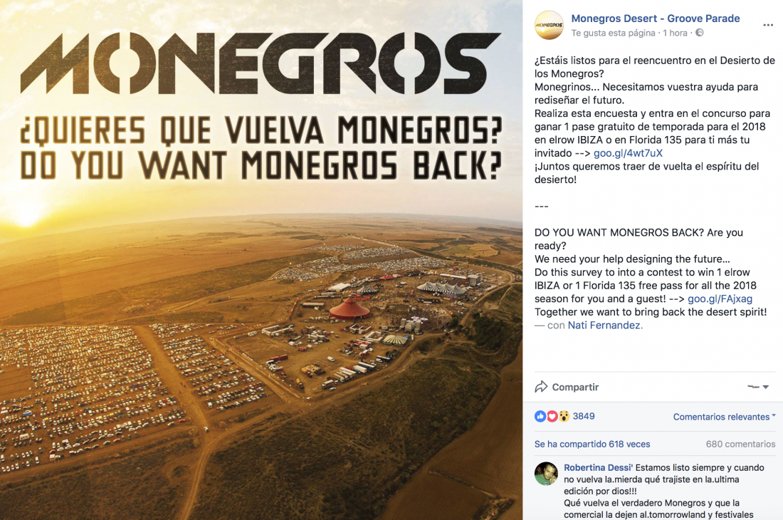 Pues parece que ese día ha llegado, hoy a través de las redes sociales de Monegros Desert Festival, se empieza a “calentar” la cosa, con una encuesta que dice: ¿Quieres que vuelva Monegros?