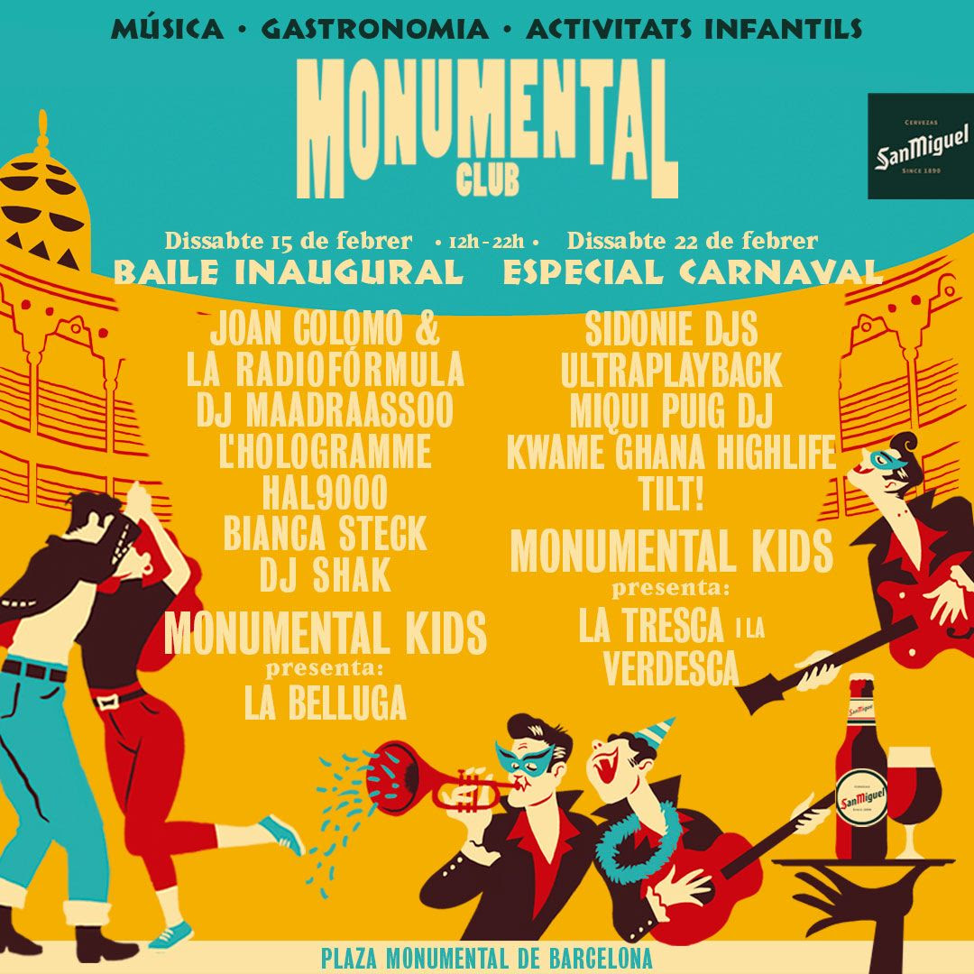 El cartel musical del Especial Carnaval estará protagonizado por Ultraplayback y Kwame Ghana Highlife. La irreverencia de las canciones de Ultraplayback lleva más de 15 años haciendo que suenen en conciertos y festivales, y es que la banda presenta una fiesta desacomplejada con letras que son ya himnos de la antimodernidad condal. A sus antípodas, demostrando una vez más la capacidad que tiene Monumental Club para mezclar géneros y artistas sin ningún miedo ni prejuicio, tenemos a Kwame Ghana Highlife, el proyecto del multiinstrumentalista ghanés Kwame, artista que conjuga lo moderno con lo antiguo respetando los ritmos de su Ghana natal. El cartel de DJs no se queda atrás con tres auténticos clásicos de la plaza: Tilt, como DJ cuasi-residente de Monumental Club; Sidonie DJs, que nos harán vibrar con la mejor música indie y alternativa, y la enciclopedia musical que es Miqui Puig DJ. Por su parte, el cartel de Monumental Kids estará protagonizado por La Tresca i la Verdesca.