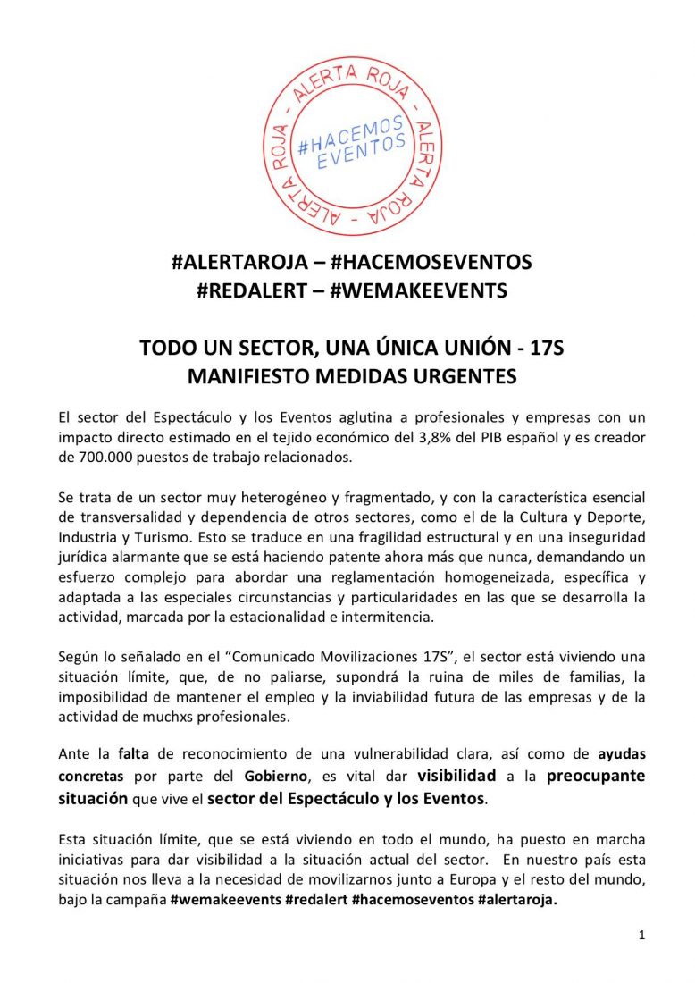 Treinta y siete organizaciones participan en esta movilización bajo el lema: Alerta roja – #hacemoseventos que promueve: Mute y que declaran que “el sector está viviendo una situación límite, que, de no paliarse, supondrá la ruina de miles de familias, la imposibilidad de mantener el empleo y la inviabilidad futura de las empresas y de la actividad de muchos profesionales”.