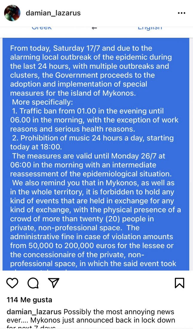 El aumento de casos de Covid19 en los últimos días ha provocado que el Gobierno griego vuelque todo su trabajo de prohibiciones en el ocio y la restauración de zonas turísticas como puedan ser la isla de Mykonos.