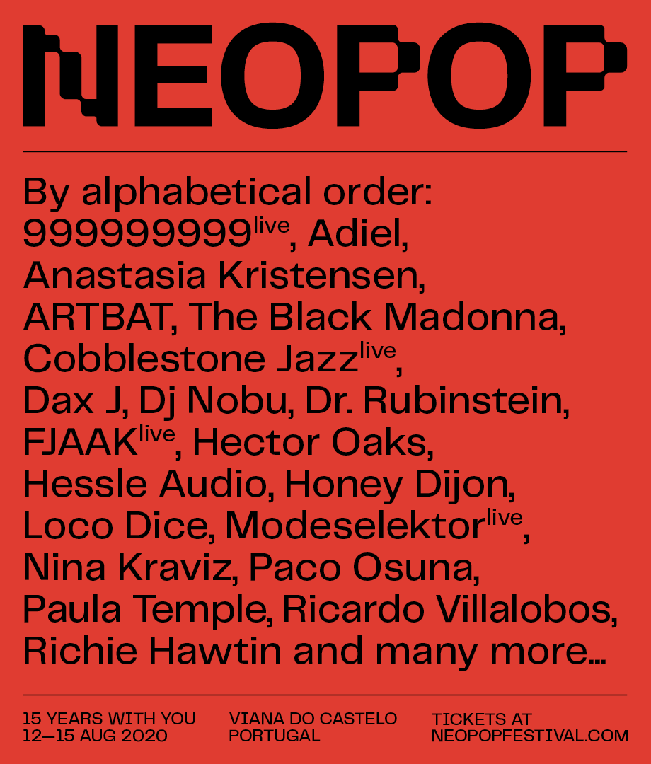 Hace unas semanas Neopop Festival daba el pistoletazo de salida a su edición 2020 con el anuncio de sus primeras confirmaciones. Una lista que incluía a The Black Madonna, Cobblestone Jazz (live), FJAAK (live), Hessle Audio, Honey Dijon, Loco Dice, Modeselektor (live) y Paco Osuna. Ahora, el festival continúa subiendo el listón con la segunda fase de su line-up, la cual da la bienvenida a una interesante combinación de artistas, algunos de los cuales repetirán experiencia mientras que otros harán su debut. Nos estamos refiriendo a 999999999 (live), Adiel, Anastasia Kristensen, ARTBAT, Dax J, DJ Nobu, Dr. Rubinstein, Héctor Oaks, Nina Kraviz, Paula Temple, Ricardo Villalobos y Richie Hawtin.