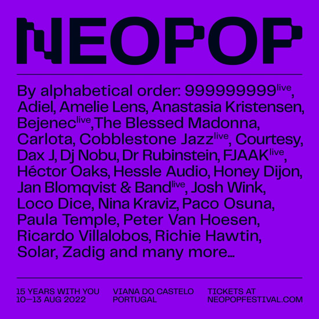 Al más puro estilo NEOPOP, el festival acogerá al mismo tiempo a algunas de las figuras más importantes de la industria electrónica y a los talentos underground más destacados. La primera tanda de artistas confirmados combina rostros habituales en NEOPOP con artistas nuevos que actuarán por primera vez en Viana do Castelo. 999999999 live, Adiel, Amelie Lens, Anastasia Kristensen, Bejenec live, The Blessed Madonna, Carlota, Cobblestone Jazz live, Courtesy, Dax J, Dj Nobu, Dr Rubinstein, FJAAK live, Héctor Oaks, Hessle Audio, Honey Dijon, Jan Blomqvist & Band live, Josh Wink, Loco Dice, Nina Kraviz, Paco Osuna, Paula Temple, Peter Van Hoesen, Ricardo Villalobos, Richie Hawtin, Solar y Zadig.