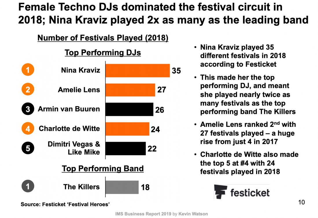 La rusa Nina Kraviz, es la Dj que en más festivales ha pinchado en 2018, exactamente en 35, la cifra ofrecida por Festickets. Amelie lens le sigue en la lista con 27 festivales. En la tercera posición encontramos a Armin Van Buuren con 26 actuaciones. En el cuarto puesto vuelve a aparecer otra mujer dj, Charlotte de Witte y en el quinto puesto, Dimitri Vegas & Like Mike.