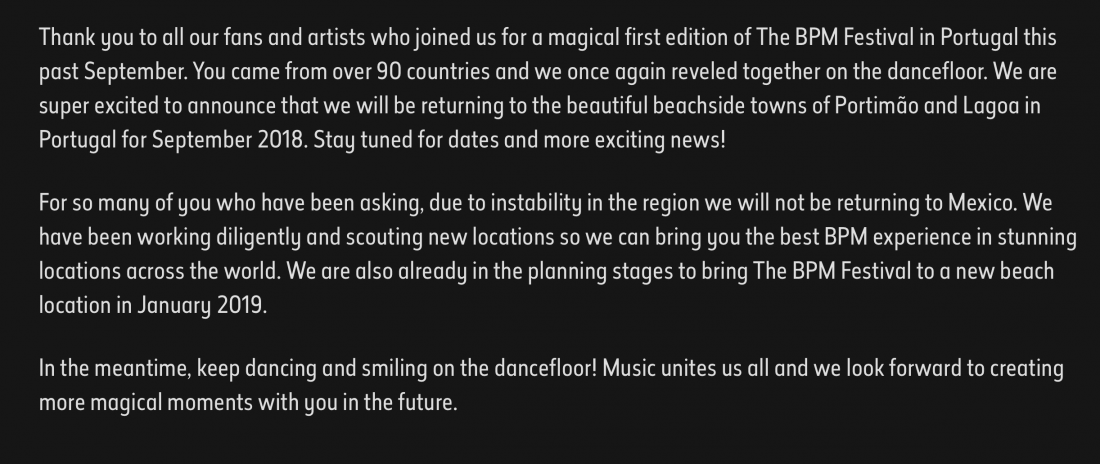 Por si había alguna duda, el festival BPM lo ha vuelto a dejar claro, no habrá edición 2018 en playa del Carmen, ni en otro lugar del planeta.