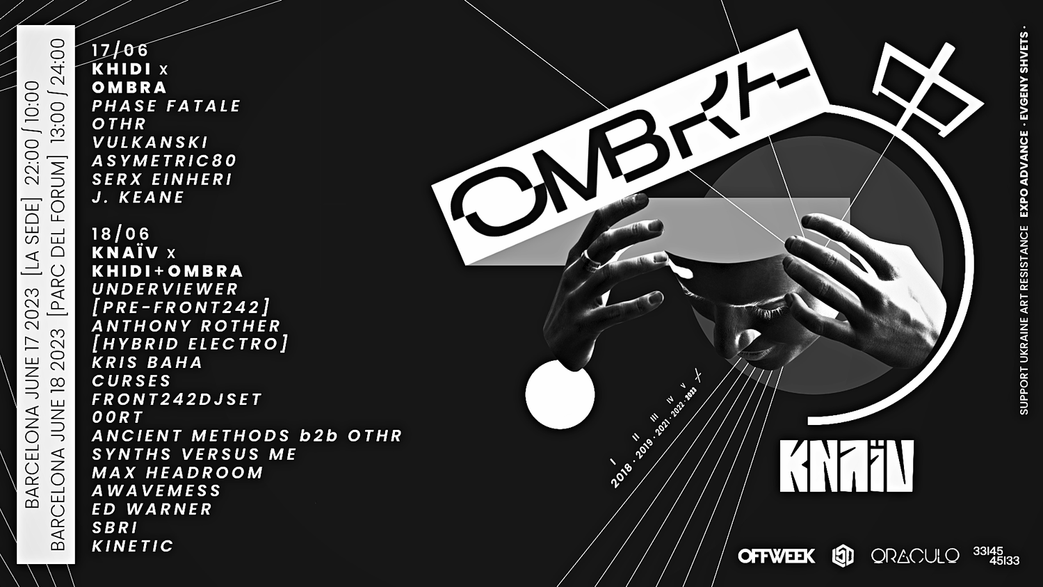 La fiesta dará clausura a OFFWEEK de la mejor manera imaginable y servirá como perfecta excusa para presentar al recién nacido sello discográfico barcelonés Knaïv, que se ha unido al OMBRA y a Khidi, el sello procedente de la capital georgiana Tiflis, para poder hacerla posible. Así pues, el público podrá disfrutar de nada menos que 11 horas de música electro, techno, acid, EBM y nu-wave en una inmensa carpa de circo situada en el icónico Parc del Fòrum, que contará con dos escenarios en los cuales artistas de vanguardia de Barcelona y de todo el mundo mesmerizarán a todos los asistentes.