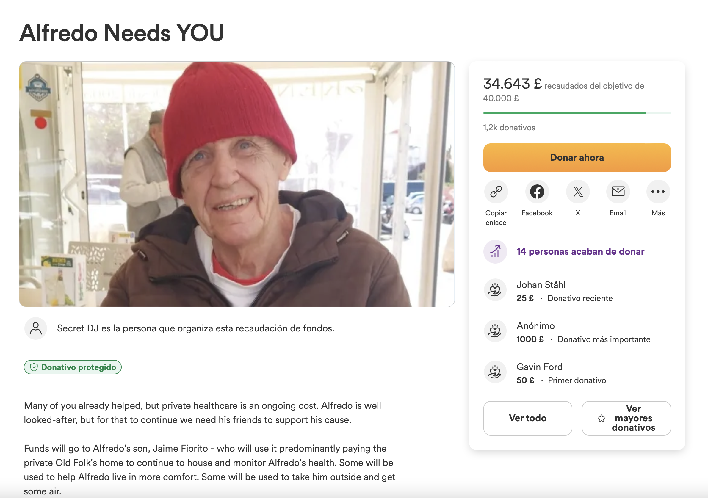 Alfredo y su familia vuelven a necesitar ayuda para poder cubrir los gastos médicos y y las cuotas de la residencia de ancianos donde Alfredo se encuentra desde hace algún tiempo. El mítico dj sufrió varios problemas graves de salud durante el año 2021, y esto unido a su edad, le han causado la imposibilidad de seguir ejerciendo su profesión.