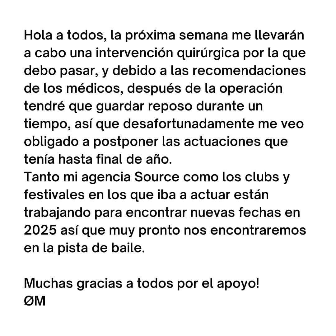 Debido a una próxima intervención quirúrgica y siguiendo las recomendaciones de su equipo médico, el artista se verá obligado a tomar un descanso prolongado, lo que conlleva la postergación de sus actuaciones previstas para el resto del año. A continuación, el mensaje completo de Oscar Mulero: