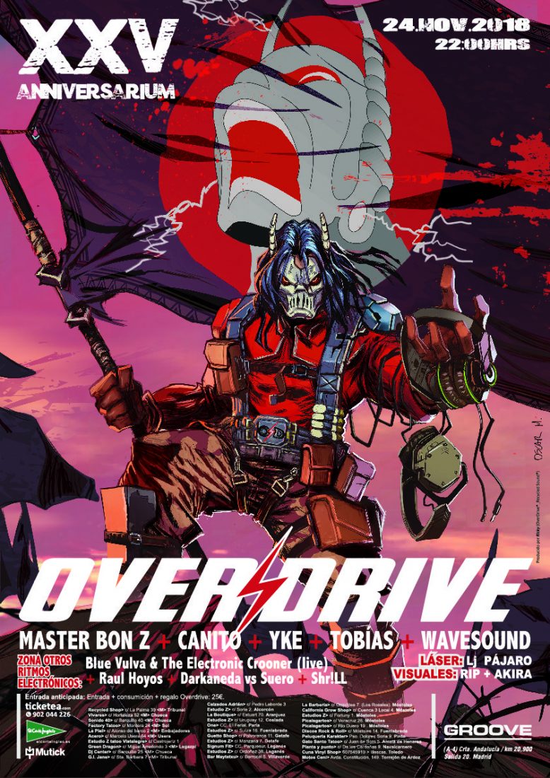 Este año de cumplimiento de tan importante efeméride OverDrive renacerá de sus cenizas cual ave fénix para celebrar el sábado 24 de noviembre en su XXV Anniversarium en la sala Groove. Y lo hará de la mano del equipo causante de su génesis que no es otro que el conformado por Canito, una de las figuras más influyentes e imprescindibles de la escena electrónica nacional, Wavesound, fundador del sello Recycled Sound, Master Bon Z, quien ha hecho de la improvisación su forma de vida desde la década de los ´90, Yke, autor de residencias icónicas como New World, Thë Omën y por supuesto OverDrive, Tobias, otro de los rostros esenciales de la génesis de la electrónica española, y LJ Pajaro y sus láseres, porque OverDrive no sería OverDrive sin los despliegues técnicos y visuales de este mago de la iluminación.