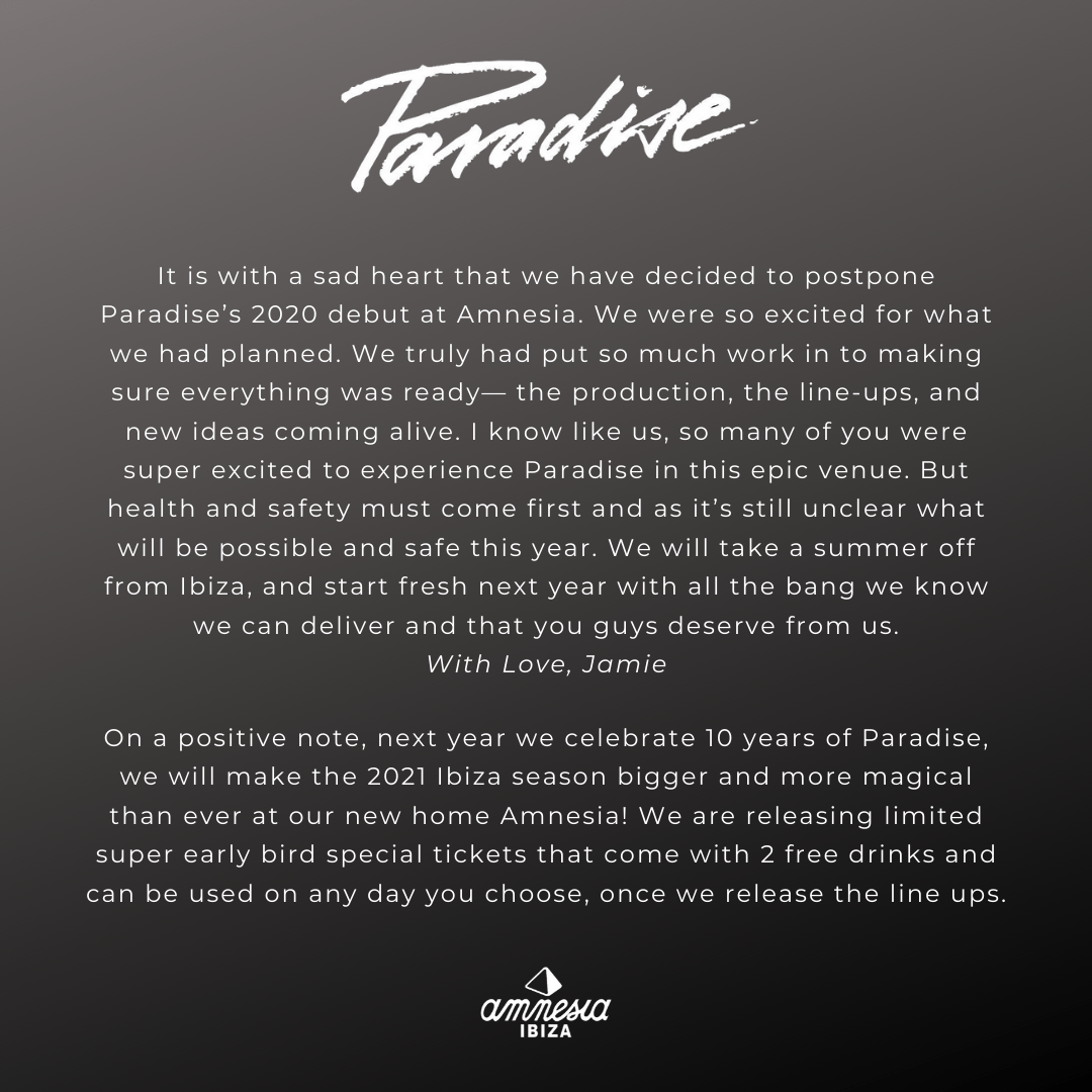 Ahora Paradise y Jamie Jones deberán de esperar hasta 2021 para el esperado estreno en Amnesia.