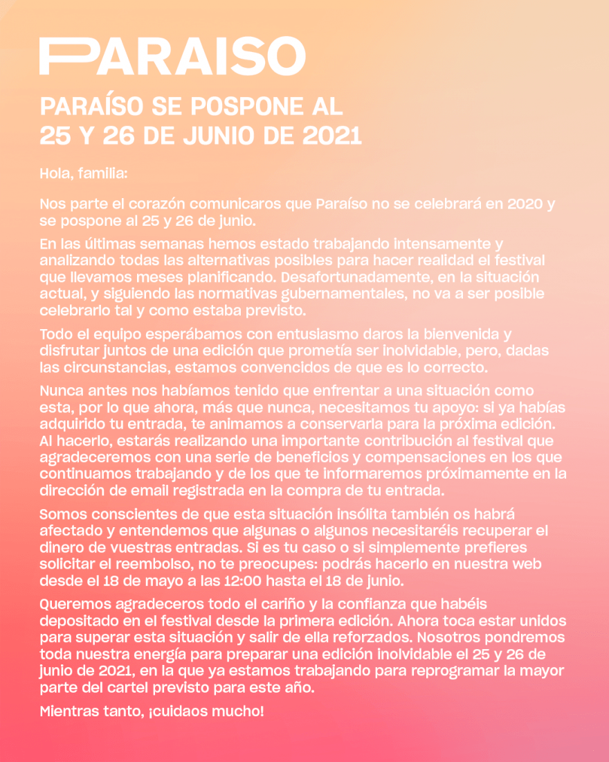 Paraíso queda pospuesto para los días 25 y 26 de junio del próximo año, ante la imposibilidad de celebrar su edición prevista para el próximo mes.