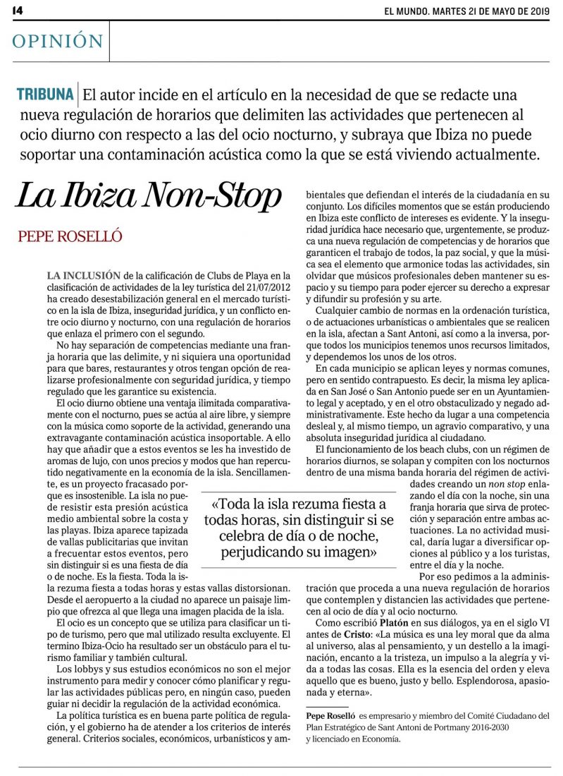 Pepe Roselló, el propietario de Space Ibiza y miembro del comité ciudadano del plan estratégico de Sant Antony, sorprendió en el día de ayer, con un interesante artículo de opinión en el periódico El Mundo.