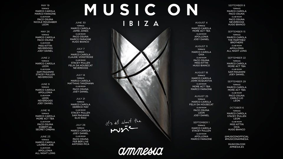 Ya conocemos la programación semanal de Music On para las 21 semanas de este verano 2017 en Amnesia Ibiza.
