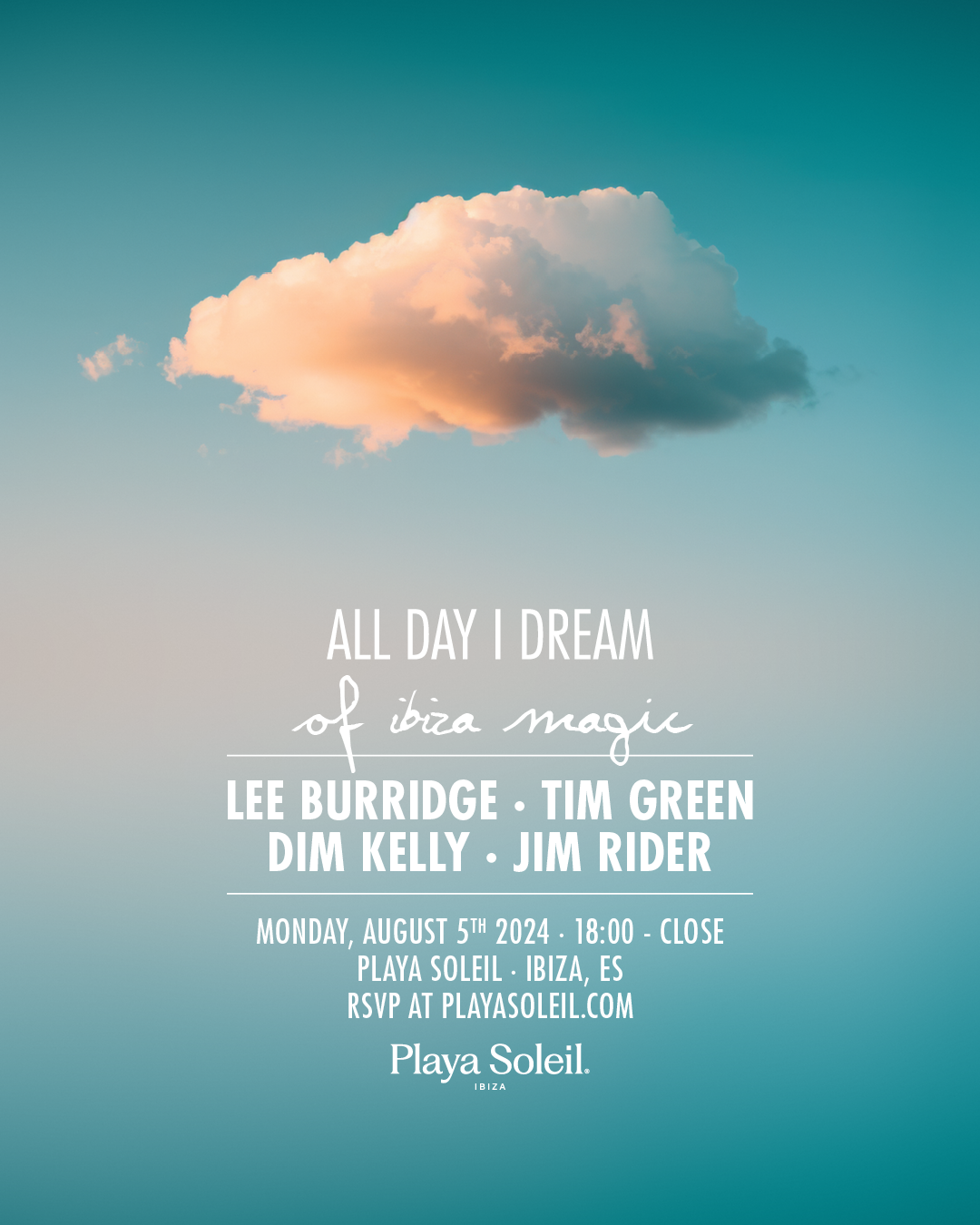Después de un memorable mes de julio, All Day I Dream regresa a Playa Soleil con otra fiesta en la que los sonidos house serán los grandes protagonistas. El pasado evento fue una oda a la música electrónica que trae vibraciones positivas a la pista de baile donde todos, independientemente de su edad, género y nacionalidad, se encuentran bailando en Playa Soleil. Lee Burridge ha conseguido crear una atmósfera especial e inmersiva gracias a la cual te transportarás a un estado nunca antes visto en la isla. El próximo lunes 5 de agosto prepárate para dejarte llevar por la energía que rescata la esencia pura de la isla.